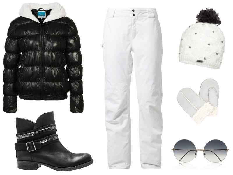 Do białych spodni narciarskich proponujemy czarną puchową kurtkę z kołnierzem typu baranek. Kontrastowe biało-czarne zestawy są nadal na topie. Do kompletu świetnie pasują czarne botki Carinii z podwójnym paskiem wokół cholewki zdobionym błyszczącymi dżetami. Ciepło zapewnią czapka z modnym pomponem i futrzane rękawiczki, a ochronę przed słońcem okulary przeciwsłoneczne z filtrem.
