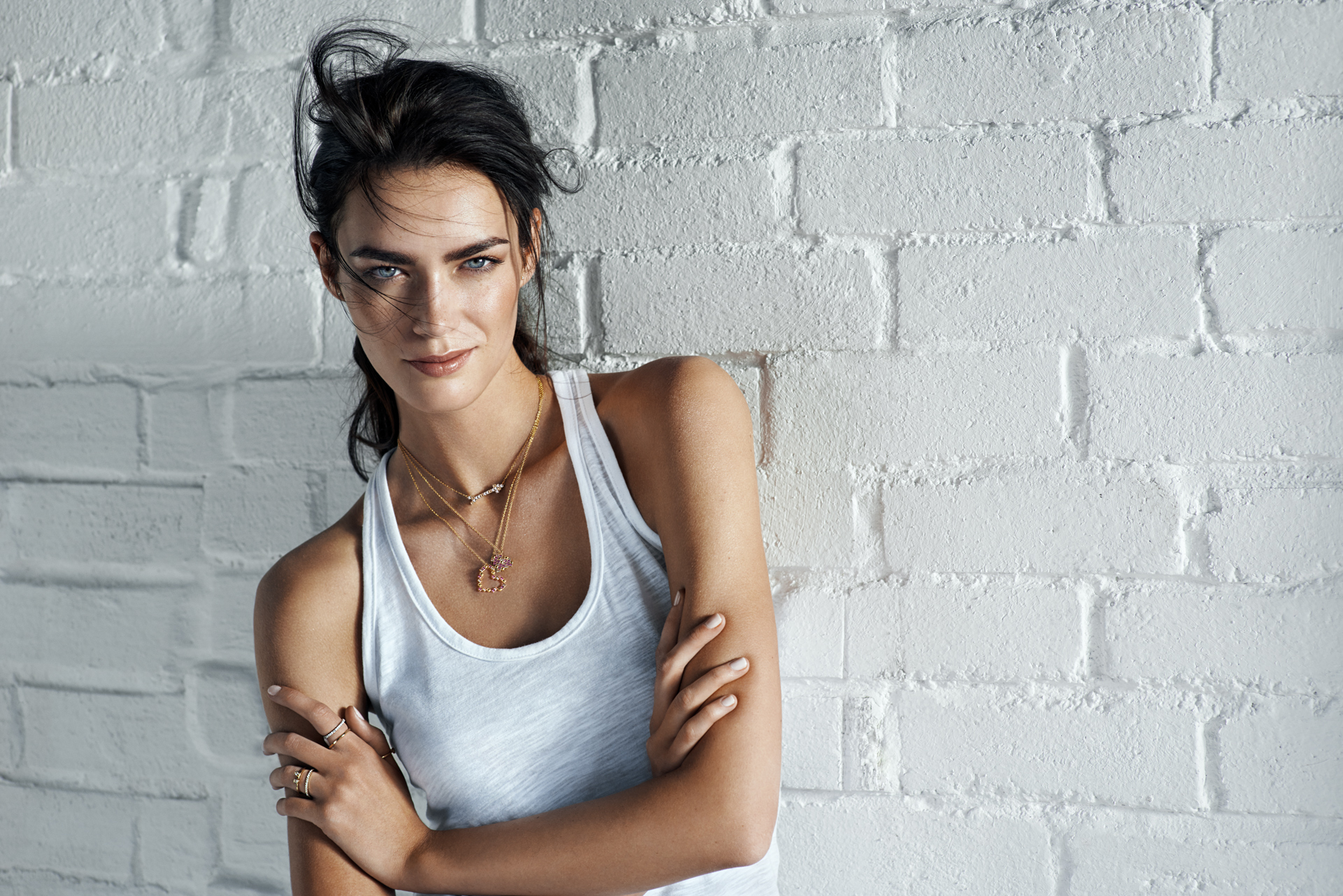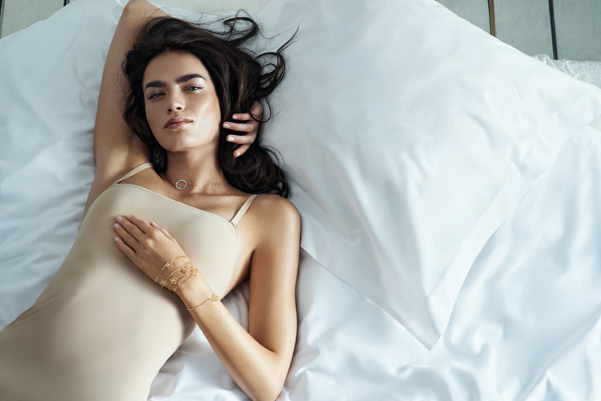 Atmosferę zdjęć – zupełnie jak codzienne piękno – budują detale: biała pościel, geometryczny golf, surowa ściana z cegieł, wreszcie biżuteria wyrażająca indywidualizm.